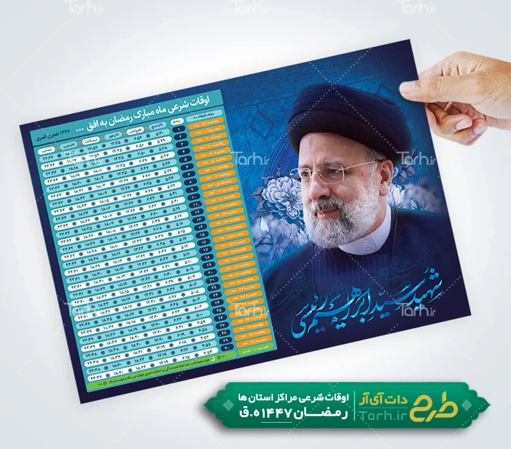 طرح لایه باز تراکت اوقات شرعی رمضان با عکس شهید رئیسی کد فایل 6840537