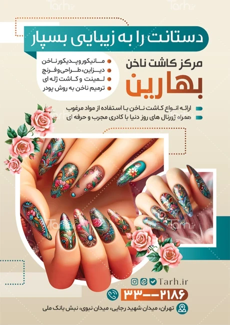 طرح خام تراکت طراحی و کاشت ناخن با فرمت psd و قابل ویرایش در نرمافزار فتوشاپ بهصورت لایه باز توسط تیم طراحان طرح دات آی آر طراحی شده است. در نمونه تراکت مرکز کاشت ناخن از تصاویر و المانهای باکیفیت و متناسب با استاندارد چاپ استفادهشده، همچنین نکات مهم در طرح تراکت آرایشگاه زنانه مانند رنگبندی، رعایت حاشیه، فاصلهها، فضای کافی برای درج متن، سایز و نوع فونت مناسب طراحی تراکت و ... رعایت گردیده است. طرح لایه باز تراکت مرکز کاشت ناخن و آرایشگاه بانوان شامل عکس ناخن میباشد که المانهای استفادهشده در طرح تراکت خدمات ناخن قابلیت ویرایش، جابهجایی و تغییر سایز را دارا بوده و شما میتوانید متناسب باسلیقه خودتان تراکت خام کاشت ناخن را ویرایش نمایید، همچنین با تغییر تصاویر و متنها میتوانید طرح تراکت خام مرکز کاشت ناخن را به طرح تراکت کسب و کار مد نظر خود شخصی سازی نمایید.