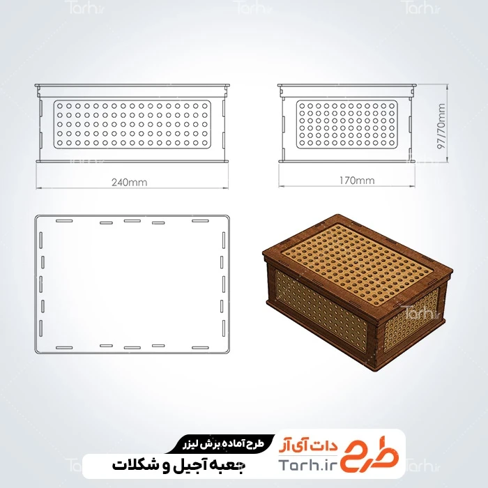 طرح برش لیزری جعبه آجیل و شکلات با نرم افزار Corel Draw به صورت لایه باز و قابل ویرایش توسط تیم طراحان طرح دات آی آر طراحی شده است. در طرح برش لیزری جعبه آجیل و خشکبار نکات مهم طراحی لیزر مانند رعایت ضخامت چوب، ابعاد استاندارد طرح و چیدمان درست برای کمترین پرتی رعایت گردیده است. طرح لایه باز لیزر جعبه آجیل، آماده اجرا توسط دستگاه های برش، سی ان سی (CNC)، حکاکی لیزر و حکاکی روی چوب میباشد. شما میتوانید از این طرح لیزر برای تولید انواع جعبه های آجیل استفاده کنید.