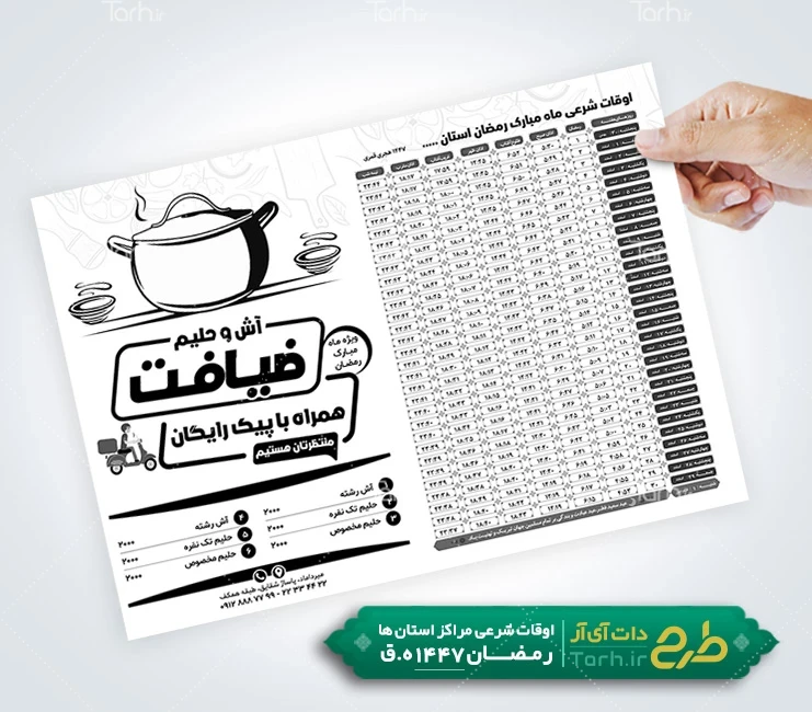 طرح تراکت ریسو آش و حلیم فروشی با فرمت psd و قابل ویرایش در نرم افزار فتوشاپ به صورت لایه باز توسط تیم طراحان طرح دات آی آر طراحی شده است. لازم به ذکر است که طرح اوقات شرعی ماه رمضان برگرفته از موسسه ژئوفیزیک میباشد. همچنین در تراکت ریسو آش فروشی و اوقات شرعی رمضان از تصاویر و المان های با کیفیت و متناسب با استاندارد چاپ استفاده گردیده است. طرح ریسو اوقات شرعی رمضان و فروشگاه آش و هلیم شامل جدول اوقات شرعی رمضان سال 1404، مراکز استانها، وکتور ظرف آش و حلیم و وکتور دیگ می باشد که المان های استفاده شده در تراکت ریسو لایه باز اوقات شرعی رمضان قابلیت ویرایش، جابه جایی و تغییر سایز را دارا بوده و شما می توانید متناسب با سلیقه خودتان طرح اوقات شرعی را ویرایش نمایید.