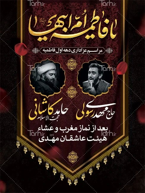 بنر لایه باز اطلاعیه ایام فاطمیه با فرمت psd و قابل ویرایش در نرم افزار فتوشاپ به صورت لایه باز توسط تیم طراحان طرح دات آی آر طراحی شده است. در طرح لایه باز اطلاعیه فاطمیه از تصاویر و المان های با کیفیت و متناسب با استاندارد چاپ استفاده گردیده است. طرح اطلاعیه خام ایام فاطمیه شامل تایپوگرافی یا فاطمه ام ابیها و دارای زمان و مکان مراسم روضه و عزاداری می باشد که المان های استفاده شده در بنر خام شهادت حضرت فاطمه قابلیت ویرایش، جابه جایی و تغییر سایز را دارا بوده و شما می توانید متناسب با سلیقه خودتان طرح اطلاعیه شهادت حضرت فاطمه را ویرایش نمایید.