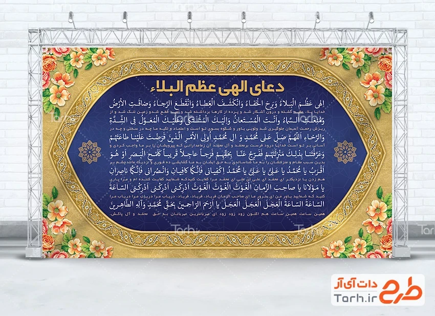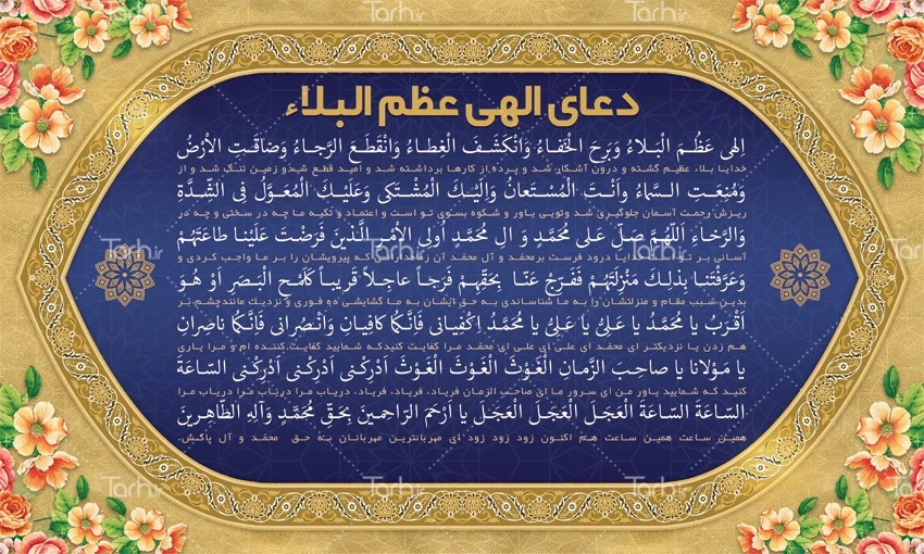 بنر دعای فرج شامل خوشنویسی دعای الهی عظم البلاء و وکتور گل جهت چاپ بنر دعای الهی عظم البلاء و چاپ بنر دعای فرج امام زمان (عج)