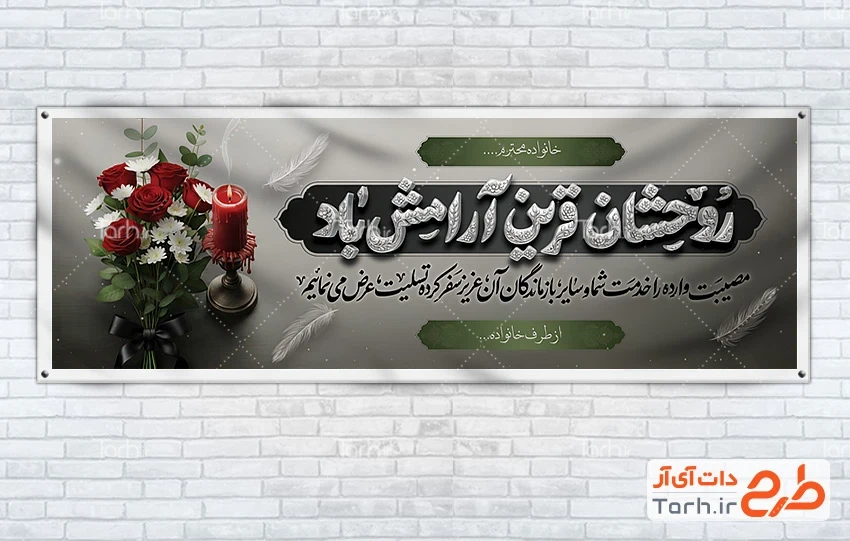 طرح آماده پلاکارد تسلیت با فرمت psd و قابل ویرایش در نرم افزار فتوشاپ به صورت لایه باز توسط تیم طراحان طرح دات آی آر طراحی شده است. در طرح لایه باز بنر تسلیت از تصاویر و المان های با کیفیت و متناسب با استاندارد چاپ استفاده گردیده است. طرح بنر تسلیت شامل خوشنویسی روحشان قرین آرامش باد و عکس گل و شمع می باشد که المان های استفاده شده در بنر لایه باز تسلیت قابلیت ویرایش، جابه جایی و تغییر سایز را دارا بوده و شما می توانید متناسب با سلیقه خودتان طرح عرض تسلیت را ویرایش نمایید.