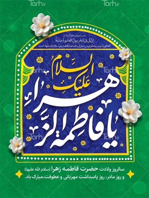 طرح بنر آماده تبریک ولادت حضرت فاطمه با خوشنویسی السلام علیک یا فاطمه الزهرا کد فایل 7042385