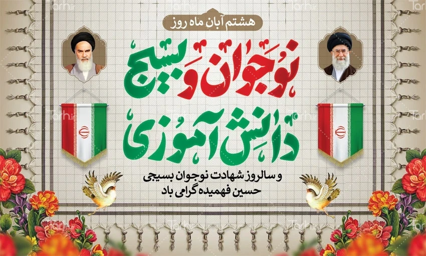 طرح لایه باز بنر روز نوجوان و بسیج دانش آموزی با فرمت psd و قابل ویرایش در نرم افزار فتوشاپ به صورت لایه باز توسط تیم طراحان طرح دات آی آر طراحی شده است. در طرح بنر شهید حسین فهمیده و روز نوجوان از تصاویر و المان های با کیفیت و متناسب با استاندارد چاپ استفاده گردیده است. پوستر هفته بسیج دانش آموزی شامل تایپوگرافی نوجوان و بسیج دانش آموزی، وکتور گل و پرچم ایران می باشد که المان های استفاده شده در طرح لایه باز بنر هفته بسیج دانش آموزی قابلیت ویرایش، جابه جایی و تغییر سایز را دارا بوده و شما می توانید متناسب با سلیقه خودتان طرح روز بسیج دانش آموزی را ویرایش نمایید.