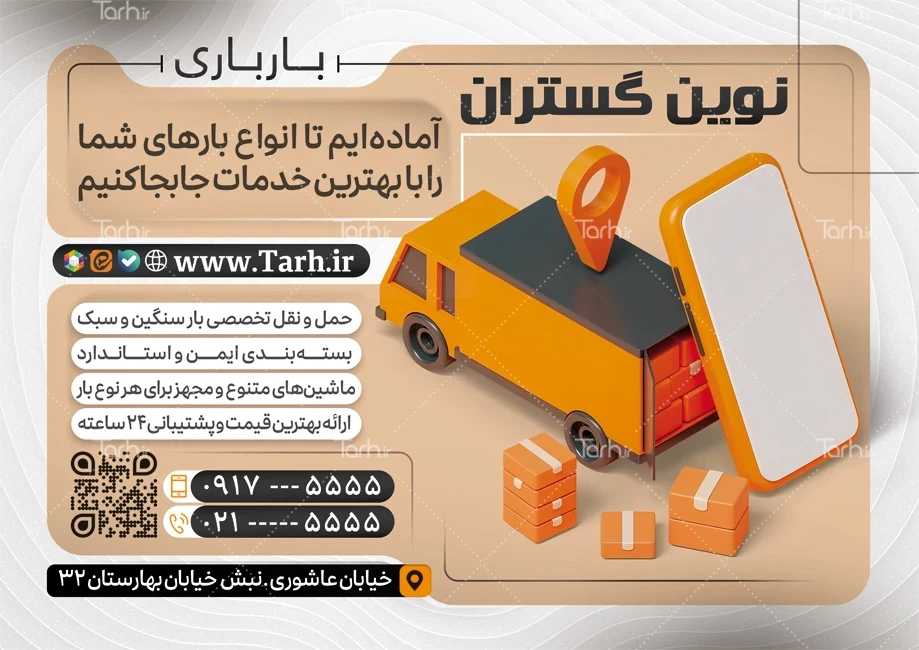 نمونه تراکت شرکت خدمات حمل و نقل با فرمت psd و قابل ویرایش در نرمافزار فتوشاپ بهصورت لایه باز توسط تیم طراحان طرح دات آی آر طراحی شده است. در نمونه تراکت باربری از تصاویر و المانهای باکیفیت و متناسب با استاندارد چاپ استفادهشده، همچنین نکات مهم در طرح تراکت باربری مانند رنگبندی، رعایت حاشیه، فاصلهها، فضای کافی برای درج متن، سایز و نوع فونت مناسب طراحی تراکت و ... رعایت گردیده است. طرح لایه باز تراکت حمل و نقل شامل عکس کامیون میباشد که المانهای استفادهشده در طرح تراکت حمل و نقل قابلیت ویرایش، جابهجایی و تغییر سایز را دارا بوده و شما میتوانید متناسب باسلیقه خودتان تراکت لایه باز باربری را ویرایش نمایید، همچنین با تغییر تصاویر و متنها میتوانید طرح تراکت خدمات حمل و نقل را به طرح تراکت کسب و کار مد نظر خود شخصی سازی نمایید.