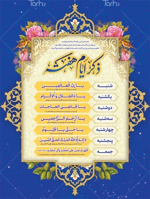 پوستر خام ذکر روزهای هفته با فرمت psd و قابل ویرایش در نرم افزار فتوشاپ به صورت لایه باز توسط تیم طراحان طرح دات آی آر طراحی شده است. در طرح لایه باز بنر ذکر ایام هفته از تصاویر و المان های با کیفیت و متناسب با استاندارد چاپ استفاده گردیده است. طرح پوستر ذکر ایام هفته شامل خوشنویسی ذکر ایام هفته، ذکر ایام هفته، طرح اسلیمی و وکتور گل می باشد که المان های استفاده شده در طرح بنر ذکر روزهای هفته قابلیت ویرایش، جابه جایی و تغییر سایز را دارا بوده و شما می توانید متناسب با سلیقه خودتان طرح لایه باز ذکر ایام هفته را ویرایش نمایید.