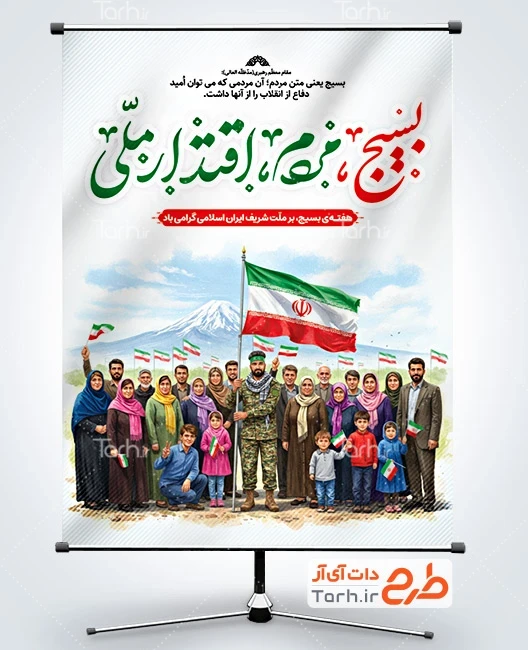 طرح بنر خام گرامیداشت هفته بسیج با تایپوگرافی شعار بسیج، مردم، اقتدار ملی کد فایل 7160825