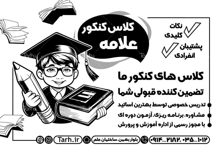 ابعاد تراکت تبلیغاتی سیاه و سفید آموزشگاه کنکور در جدول ویژگیهای فایل درجشده و با توجه به لایه باز بودن و کیفیت بالای طرح تراکت ریسو کلاس کنکور، قابلیت ویرایش و تبدیل به سایز دلخواه، همچنین چاپ روی متریالهای مختلف مانند انواع کاغذ، گلاسه، کاغذ الوان و ... را دارا میباشد. همچنین میتوان طرح سیاه سفید آموزش کنکور را در زمینه های چاپ سیلک ، نایلون، ساک دستی، پاکت دستی و کیسه نیز استفاده کرد. تراکت های سیاه سفید یا ریسو یک ابزار تبلیغاتی بسیار موثر محسوب می شوند و به دلیل هزینه کم و تأثیر بالا، در بسیاری از کسب و کارها به عنوان روشی اقتصادی و موثر برای انتقال اطلاعات به مخاطبان برای تبلیغات و رویدادهای مختلف استفاده میشوند.
