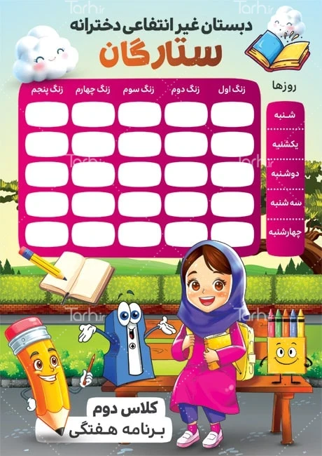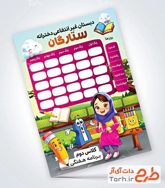 طرح برنامه کلاسی مدرسه لایه باز با فرمت psd و قابل ویرایش در نرم افزار فتوشاپ به صورت لایه باز توسط تیم طراحان طرح دات آی آر طراحی شده است. در طرح برنامه هفتگی مدرسه از تصاویر و المانهای با کیفیت و متناسب با استاندارد چاپ استفاده شده است. طرح لایه باز برنامه کلاسی برای برنامه ریزی درسی هفتگی در مدارس، مراکز آموزشی و همچنین استفاده شخصی دانش آموزان کاربرد دارد. طرح آماده برنامه کلاسی مدرسه از جلمه برنامه هفتگی مدرسه ابتدایی شامل تصویرسازی دانش آموز و مداد میباشد. المانهای استفاده شده در طرح برنامه کلاسی مدارس قابلیت ویرایش، جابه جایی و تغییر سایز را دارا بوده و شما می توانید متناسب با سلیقه خودتان طرح لایه باز برنامه هفتگی را ویرایش نمایید.