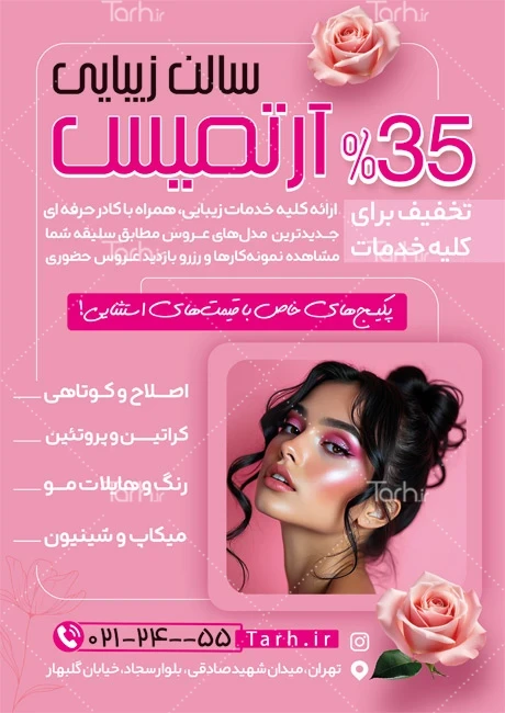 طرح تراکت تبلیغاتی آرایشگاه بانوان با فرمت psd و قابل ویرایش در نرمافزار فتوشاپ بهصورت لایه باز توسط تیم طراحان طرح دات آی آر طراحی شده است. در نمونه تراکت آرایشگاه زنانه از تصاویر و المانهای باکیفیت و متناسب با استاندارد چاپ استفادهشده، همچنین نکات مهم در پوستر تبلیغاتی سالن زیبایی زنانه مانند رنگ بندی، رعایت حاشیه، فاصلهها، فضای کافی برای درج متن، سایز و نوع فونت مناسب طراحی تراکت و ... رعایت گردیده است. طرح لایه باز تراکت آرایشگاه زنانه شامل عکس مدل آرایشی و زیبایی میباشد که المانهای استفادهشده در طرح تراکت آرایشگاه بانوان قابلیت ویرایش، جابهجایی و تغییر سایز را دارا بوده و شما میتوانید متناسب باسلیقه خودتان طرح تراکت آرایشگاه زنانه را ویرایش نمایید، همچنین با تغییر تصاویر و متنها میتوانید تراکت لایه باز آرایشگاه بانوان را به طرح تراکت کسب و کار مد نظر خود شخصی سازی نمایید.