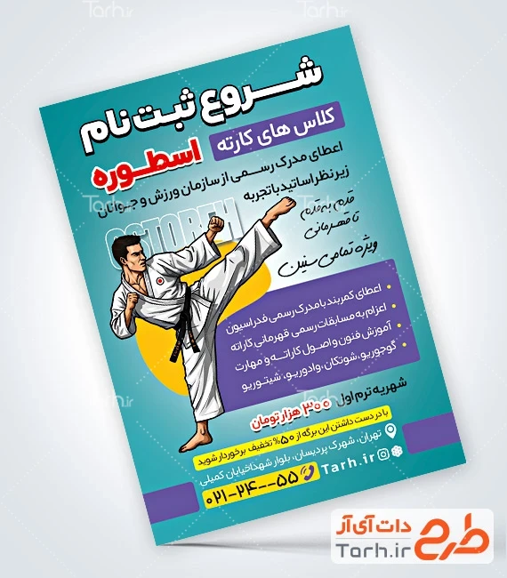 فایل لایه باز تراکت کاراته با فرمت psd و قابل ویرایش در نرمافزار فتوشاپ بهصورت لایه باز توسط تیم طراحان طرح دات آی آر طراحی شده است. در نمونه تراکت کلاس کاراته از تصاویر و المانهای باکیفیت و متناسب با استاندارد چاپ استفادهشده، همچنین نکات مهم در طرح تراکت کاراته مانند رنگبندی، رعایت حاشیه، فاصلهها، فضای کافی برای درج متن، سایز و نوع فونت مناسب طراحی تراکت و ... رعایت گردیده است. طرح لایه باز تراکت باشگاه کاراته شامل عکس مرد کاراته کار میباشد که المانهای استفادهشده در طرح تراکت باشگاه کاراته قابلیت ویرایش، جابهجایی و تغییر سایز را دارا بوده و شما میتوانید متناسب باسلیقه خودتان تراکت لایه باز کاراته را ویرایش نمایید، همچنین با تغییر تصاویر و متنها میتوانید طرح تراکت کلاس کاراته را به طرح تراکت کسب و کار مد نظر خود شخصی سازی نمایید.