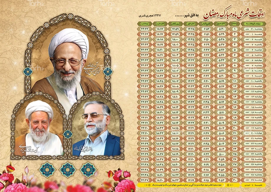 طرح تراکت اوقات شرعی رمضان 1404 با عکس شهید فخری زاده آیت الله مصباح یزدی و آیت الله محمد یزدی کد فایل 7361859