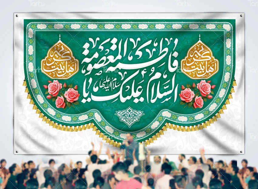 طرح کتیبه میلاد حضرت معصومه با فرمت psd و قابل ویرایش در نرم افزار فتوشاپ به صورت لایه باز توسط تیم طراحان طرح دات آی آر طراحی شده است. در طرح بنر ولادت حضرت معصومه از تصاویر و المان های با کیفیت و متناسب با استاندارد چاپ استفاده گردیده است. بنر لایه باز جایگاه میلاد حضرت معصومه شامل تایپوگرافی کریمه اهل بیت، خوشنویسی السلام علیک یا فاطمه المعصومه و وکتور گل می باشد که المان های استفاده شده در بنر لایه باز ولادت حضرت معصومه قابلیت ویرایش، جابه جایی و تغییر سایز را دارا بوده و شما می توانید متناسب با سلیقه خودتان طرح دکور ولادت حضرت معصومه را ویرایش نمایید.