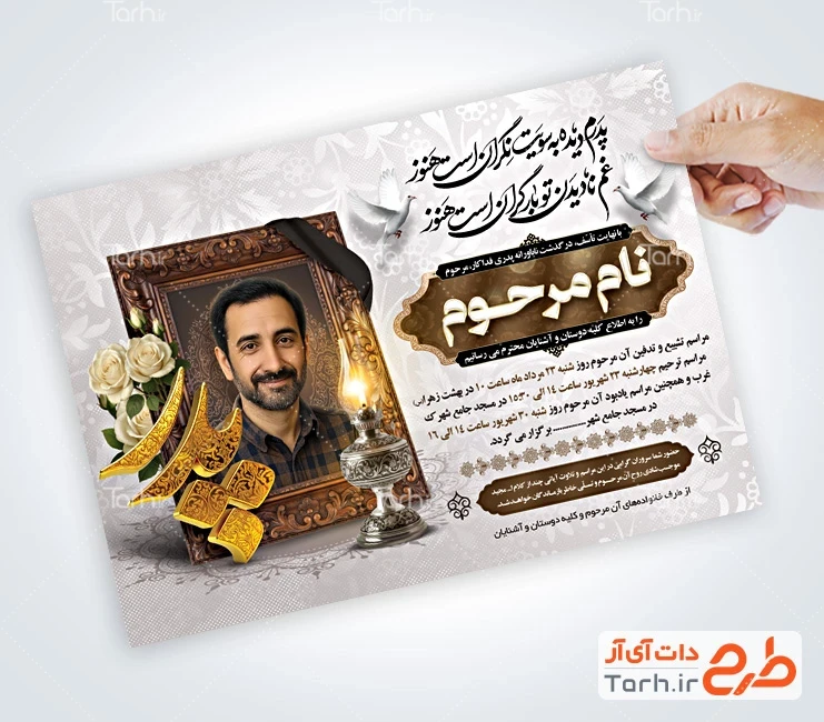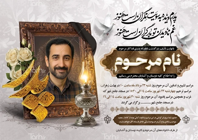 طرح آگهی ترحیم فوت پدر با فرمت psd و قابل ویرایش در نرمافزار فتوشاپ بهصورت لایه باز توسط تیم طراحان طرح دات آی آر طراحی شده است. در فایل لایه باز اعلامیه ترحیم پدر از تصاویر و المانهای باکیفیت و متناسب با استاندارد چاپ استفادهشده، همچنین نکات مهم در طرح آگهی ترحیم پدر مانند رنگبندی، رعایت حاشیه، فاصلهها، فضای کافی برای درج متن، سایز و نوع فونت مناسب طراحی آگهی ترحیم و ... رعایت گردیده است. طرح آگهی ترحیم پدر شامل جایگاه عکس پدر، شعر پدرم دیده به سویت نگران است هنوز میباشد که المانهای استفادهشده در آگهی ترحیم لایه باز پدر قابلیت ویرایش، جابهجایی و تغییر سایز را دارا بوده و شما میتوانید متناسب باسلیقه خودتان نمونه اعلامیه ترحیم پدر را ویرایش نمایید.