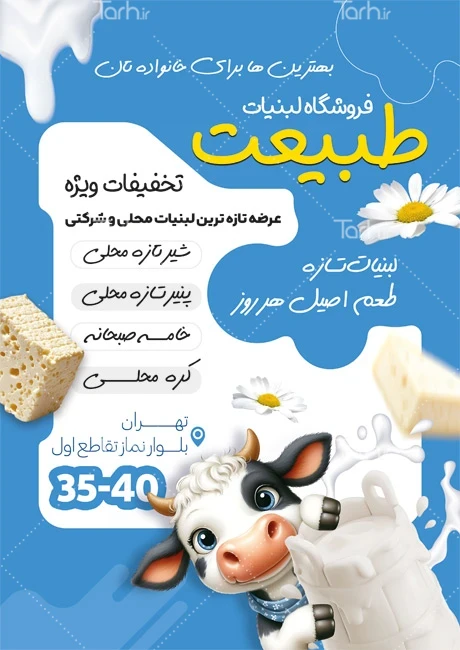طرح لایه باز تراکت سوپر لبنیاتی شامل وکتور گوساله کد فایل 7369214