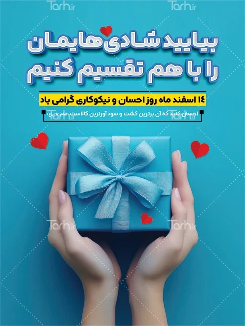پوستر خام روز احسان و نیکوکاری با فرمت psd و قابل ویرایش در نرم افزار فتوشاپ به صورت لایه باز توسط تیم طراحان طرح دات آی آر طراحی شده است. در طرح لایه باز روز احسان و نیکوکاری از تصاویر و المان های با کیفیت و متناسب با استاندارد چاپ استفاده گردیده است. طرح لایه باز پوستر روز نیکوکاری شامل متن بیایید شادی هایمان را با هم تقسیم کنیم و عکس جعبه هدیه میباشد که المان های استفاده شده در بنر خام روز احسان و نیکوکاری قابلیت ویرایش، جابه جایی و تغییر سایز را دارا بوده و شما می توانید متناسب با سلیقه خودتان طرح پوستر روز احسان و نیکوکاری را ویرایش نمایید.