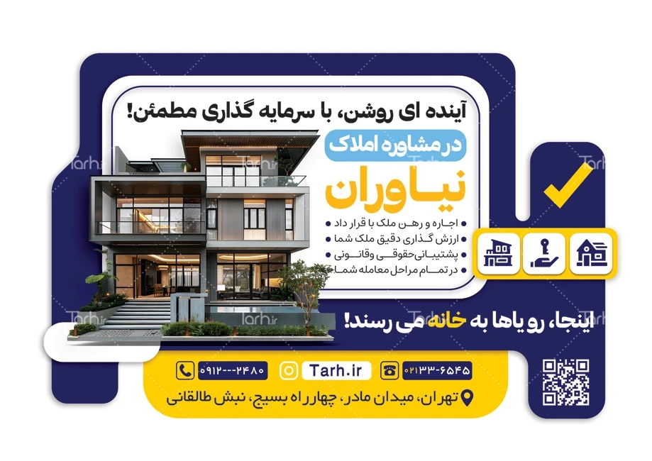 طرح لایه باز تراکت مشاور املاک با فرمت psd و قابل ویرایش در نرمافزار فتوشاپ بهصورت لایه باز توسط تیم طراحان طرح دات آی آر طراحی شده است. در نمونه تراکت بنگاه مسکن از تصاویر و المانهای باکیفیت و متناسب با استاندارد چاپ استفادهشده، همچنین نکات مهم در تراکت مشاور املاک مانند رنگبندی، رعایت حاشیه، فاصلهها، فضای کافی برای درج متن، سایز و نوع فونت مناسب طراحی تراکت و ... رعایت گردیده است. دانلود طرح تراکت املاک شامل عکس نمای بیرونی ویلا میباشد که المانهای استفادهشده در طرح لایه باز تراکت مشاور املاک قابلیت ویرایش، جابهجایی و تغییر سایز را دارا بوده و شما میتوانید متناسب باسلیقه خودتان تراکت لایه باز املاک را ویرایش نمایید، همچنین با تغییر تصاویر و متنها میتوانید طرح تراکت مشاور املاک را به طرح تراکت کسب و کار مد نظر خود شخصی سازی نمایید.