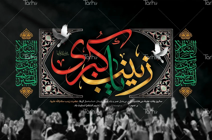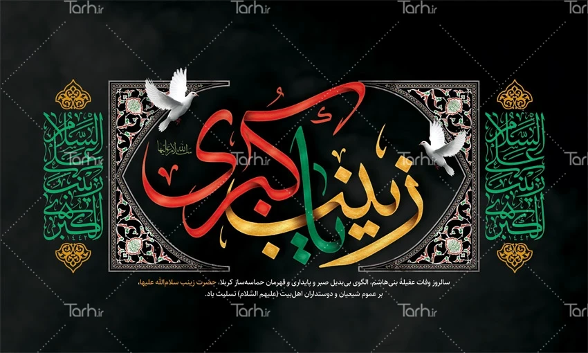 طرح آماده بنر پشت منبر عزاداری وفات حضرت زینب با خوشنویسی یا زینب کبری کد فایل 7416905