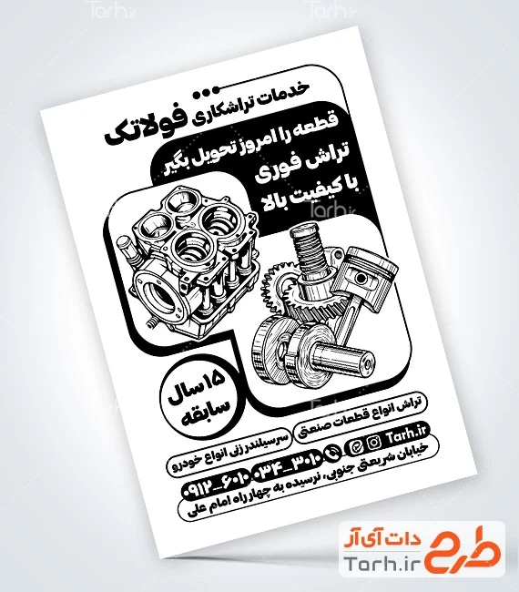نمونه تراکت سیاه سفید خدمات تراشکاری دارای وکتور قطعات خودرو کد فایل 7439561