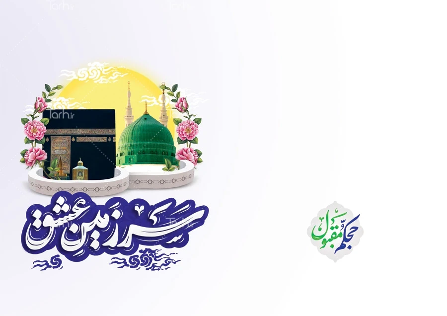 طرح کارت دعوت ولیمه مهمانی حج و زیارت دارای خوشنویسی سرزمین عشق کد فایل 7450319