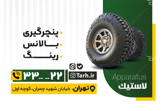 طرح psd کارت ویزیت آپاراتی با فرمت psd و قابل ویرایش در نرمافزار فتوشاپ بهصورت لایه باز و پشت و رو (دو رو) توسط تیم طراحان طرح دات آی آر طراحی شده است. طرح کارت ویزیت لاستیک فروشی از تصاویر و المانهای باکیفیت و متناسب با استاندارد چاپ استفادهشده، همچنین نکات مهم در طرح کارت ویزیت مانند رنگبندی، رعایت حاشیه، فاصلهها، فضای کافی برای درج متن، سایز و نوع فونت مناسب طراحی کارت ویزیت و ... رعایت گردیده است. نمونه کارت ویزیت لاستیک فروشی شامل عکس لاستیک میباشد که المانهای استفادهشده در طرح کارت ویزیت لاستیک و آپاراتی قابلیت ویرایش، جابهجایی و تغییر سایز را دارا بوده و شما میتوانید متناسب باسلیقه خودتان کارت ویزیت لایه باز لاستیک فروشی را ویرایش نمایید، همچنین با تغییر تصاویر و متنها میتوانید طرح کارت ویزیت آپاراتی و لاستیک فروشی را به طرح کارت ویزیت کسب و کار مد نظر خود شخصی سازی نمایید.