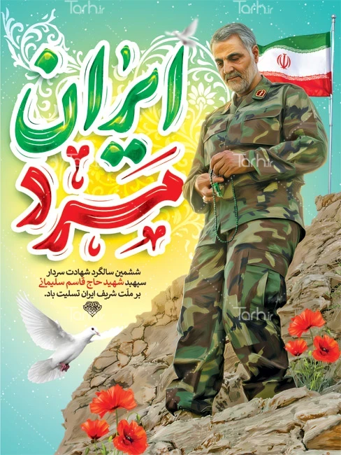 طرح بنر سالگرد شهادت سردار سلیمانی با تایپوگرافی شعار ایران مرد کد فایل 7492513