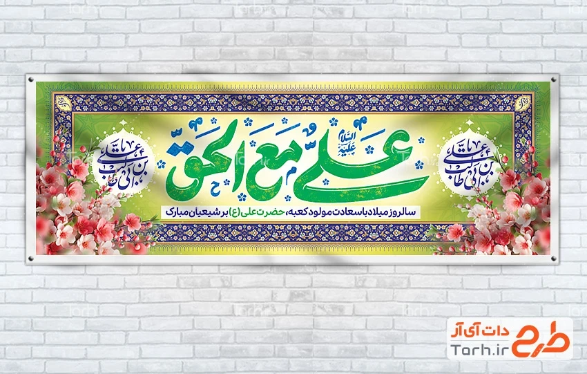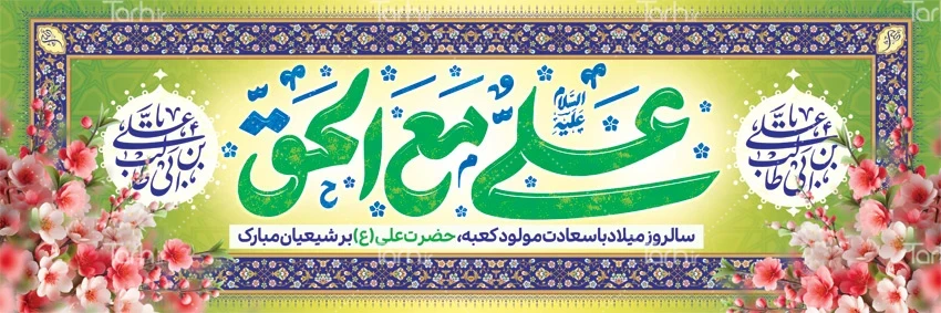 طرح قابل ویرایش پلاکارد ولادت امام علی شامل تایپوگرافی علی مع الحق کد فایل 7526139