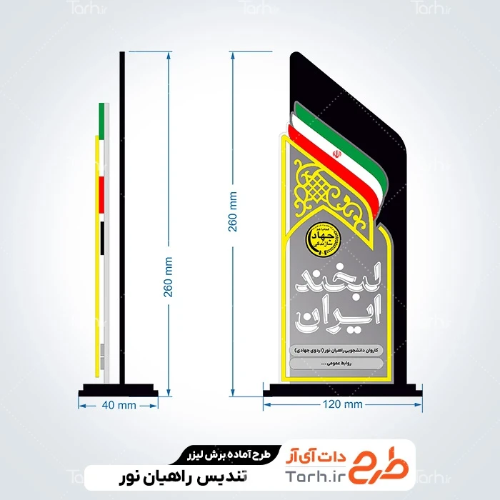 طرح آماده لیزر تندیس اردوی جهادی راهیان نور با نرم افزار Corel Draw به صورت لایه باز و قابل ویرایش توسط تیم طراحان طرح دات آی آر طراحی شده است. در طرح آماده برش لیزری تندیس اردوی جهادی راهیان نور نکات مهم طراحی لیزر مانند رعایت ضخامت چوب، ابعاد استاندارد طرح و چیدمان درست برای کمترین پرتی رعایت گردیده است. طرح راهیان نور خام، آماده اجرا توسط دستگاه های برش، سی ان سی (CNC)، حکاکی لیزر و حکاکی روی چوب میباشد. شما میتوانید از طرح لیزر تندیس اردوی جهادی راهیان نور خام جهت تولید انواع تندیس و استند تقدیر روز شهدا به عنوان هدیه در مراسمات استفاده کنید.