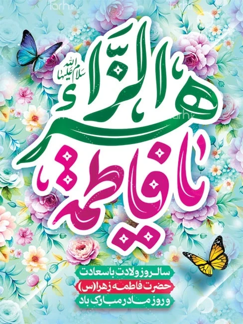 دانلود بنر تبریک میلاد حضرت فاطمه با فرمت psd و قابل ویرایش در نرم افزار فتوشاپ به صورت لایه باز توسط تیم طراحان طرح دات آی آر طراحی شده است. در طرح لایه باز ولادت حضرت زهرا از تصاویر و المان های با کیفیت و متناسب با استاندارد چاپ استفاده گردیده است. پوستر ولادت حضرت زهرا شامل خوشنویسی یا فاطمه الزهرا، وکتور گل و پروانه میباشد که المان های استفاده شده در بنر لایه باز ولادت حضرت فاطمه قابلیت ویرایش، جابه جایی و تغییر سایز را دارا بوده و شما می توانید متناسب با سلیقه خودتان طرح بنر ولادت حضرت زهرا را ویرایش نمایید.