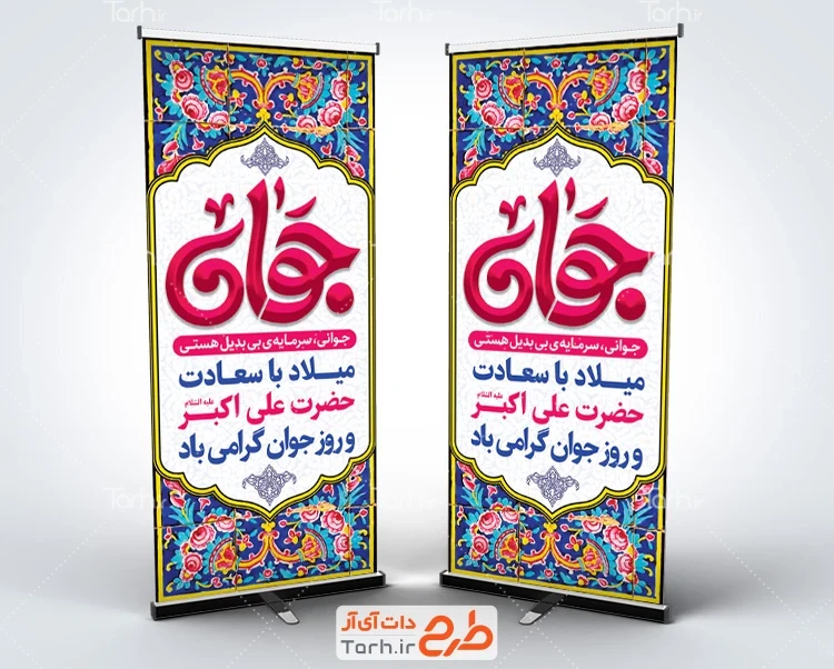 طرح لایه باز بنر ایستاده روز جوان با فرمت psd و قابل ویرایش در نرم افزار فتوشاپ به صورت لایه باز توسط تیم طراحان طرح دات آی آر طراحی شده است. در طرح لایه باز روز جوان و ولادت حضرت علی اکبر از تصاویر و المانهای با کیفیت و متناسب با استاندارد چاپ استفاده گردیده است. این طرح استند روز جوان شامل خوشنویسی علی اکبر میباشد. المانهای استفاده شده در طرح استند ولادت حضرت علی اکبر قابلیت ویرایش، جابه جایی و تغییر سایز را دارا بوده و شما میتوانید متناسب با سلیقه خودتان طرح بنر روز جوان و ولادت علی اکبر ویرایش نمایید.