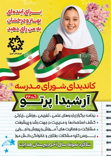 طرح تراکت انتخابات کاندیدای شورای مدرسه با فرمت psd و قابل ویرایش در نرمافزار فتوشاپ بهصورت لایه باز توسط تیم طراحان طرح دات آی آر طراحی شده است. در نمونه تراکت انتخابات شورای دانش آموزی از تصاویر و المانهای باکیفیت و متناسب با استاندارد چاپ استفادهشده، همچنین نکات مهم در تراکت لایه باز انتخابات دانش آموزی مانند رنگبندی، رعایت حاشیه، فاصلهها، فضای کافی برای درج متن، سایز و نوع فونت مناسب طراحی تراکت و ... رعایت گردیده است. طرح لایه باز تراکت انتخابات شورای مدرسه شامل عکس دانش آموز دختر میباشد که المانهای استفادهشده در طرح تراکت انتخابات شورای دانش آموزی مدرسه قابلیت ویرایش، جابهجایی و تغییر سایز را دارا بوده و شما میتوانید متناسب باسلیقه خودتان تراکت لایه باز انتخابات شورای دانش آموزی را ویرایش نمایید، همچنین با تغییر تصاویر و متنها میتوانید طرح تراکت انتخابات دانش آموزی را به طرح تراکت کسب و کار مد نظر خود شخصی سازی نمایید.
