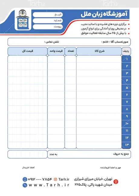 طرح لایه باز ست اداری آموزشگاه زبان با فرمت psd و قابل ویرایش در نرم افزار فتوشاپ به صورت لایه باز توسط تیم طراحان طرح دات آی آر طراحی شده است. در طرح لایه باز ست اداری آموزش زبان از رنگ، فونت و ابعاد متناسب با استاندارد چاپ استفاده گردیده است. طرح ست اداری آموزشگاه زبان شامل مجموعه طرح های کارت ویزیت، سربرگ A4، پاکت ملخی، فاکتور اختصاصی، فولدر، ساک دستی و پاکت A4 می باشد. در طرح لایه باز ست اداری کلاس زبان محل قرارگیری لوگو، نام شرکت و اطلاعات تماس تعبیه شده است. عناصر موجود در طرح ست اداری زبان لایه باز از جمله؛ رنگ، متن، فونت و لوگو قابلیت حذف، ویرایش، جابه جایی و تغییر سایز را دارند و شما میتوانید متناسب با رنگ سازمانی و لوگوی اختصاصی برند خود طرح آموزشگاه زبان را ویرایش و شخصی سازی کنید تا نام تجاری خود را بهتر نشان دهید.