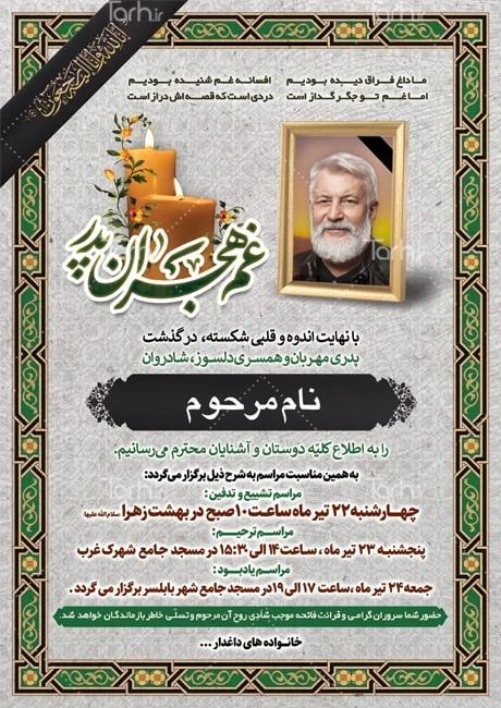 طرح لایه باز آگهی ترحیم فوت پدر با فرمت psd و قابل ویرایش در نرمافزار فتوشاپ بهصورت لایه باز توسط تیم طراحان طرح دات آی آر طراحی شده است. در فایل لایه باز اعلامیه ترحیم پدر از تصاویر و المانهای باکیفیت و متناسب با استاندارد چاپ استفادهشده، همچنین نکات مهم در طرح آگهی ترحیم پدر مانند رنگبندی، رعایت حاشیه، فاصلهها، فضای کافی برای درج متن، سایز و نوع فونت مناسب طراحی آگهی ترحیم و ... رعایت گردیده است. طرح آگهی ترحیم پدر شامل جایگاه عکس پدر، خوشنویسی غم هجران پدر و انا لله و انا الیه راجعون میباشد که المانهای استفادهشده در آگهی ترحیم لایه باز پدر قابلیت ویرایش، جابهجایی و تغییر سایز را دارا بوده و شما میتوانید متناسب باسلیقه خودتان نمونه اعلامیه ترحیم پدر را ویرایش نمایید.