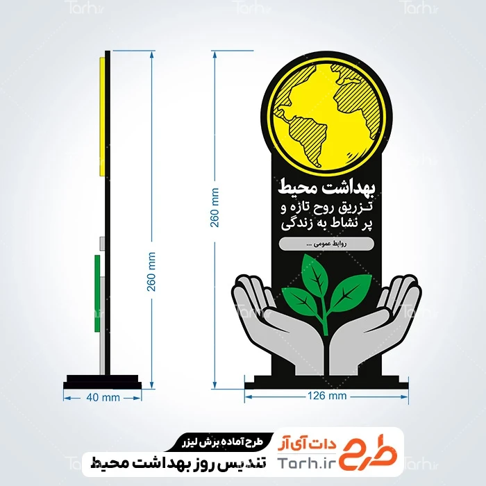 طرح لیزر تندیس روز بهداشت محیط با نرم افزار Corel Draw به صورت لایه باز و قابل ویرایش توسط تیم طراحان طرح دات آی آر طراحی شده است. در طرح تندیس روز بهداشت محیط نکات مهم طراحی لیزر مانند رعایت ضخامت چوب، ابعاد استاندارد طرح و چیدمان درست برای کمترین پرتی رعایت گردیده است. طرح برش لیزری تندیس بهداشت محیط، آماده اجرا توسط دستگاه های برش، سی ان سی (CNC)، حکاکی لیزر و حکاکی روی چوب میباشد. شما میتوانید از طرح لیزر بهداشت محیط جهت تولید انواع تندیس و استند روز بهداشت محیط به عنوان هدیه در مراسمات بزرگداشت روز بهداشت محیط استفاده کنید.