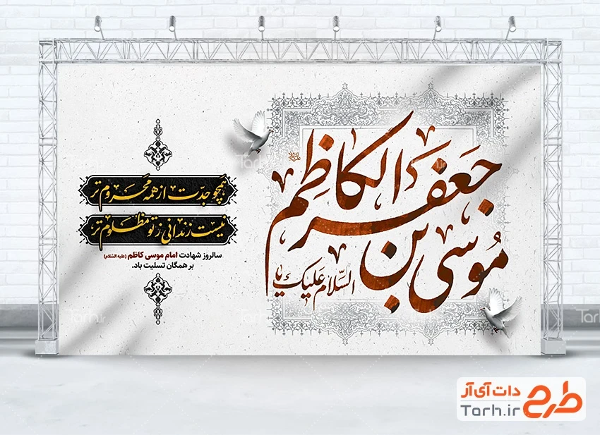 طرح بنر جایگاه عزاداری شهادت امام کاظم با فرمت psd و قابل ویرایش در نرم افزار فتوشاپ به صورت لایه باز توسط تیم طراحان طرح دات آی آر طراحی شده است. در طرح لایه باز بنر شهادت امام کاظم از تصاویر و المان های با کیفیت و متناسب با استاندارد چاپ استفاده گردیده است. طرح بنر شهادت امام کاظم شامل خوشنویسی موسی بن جعفر الکاظم، خوشنویسی شعر همچو جدت از همه محروم تر، نیست زندانی ز تو مظلوم تر میباشد که المان های استفاده شده در طرح بنر پشت مداح شهادت امام کاظم قابلیت ویرایش، جابه جایی و تغییر سایز را دارا بوده و شما می توانید متناسب با سلیقه خودتان طرح پشت منبر شهادت امام موسی کاظم را ویرایش نمایید.