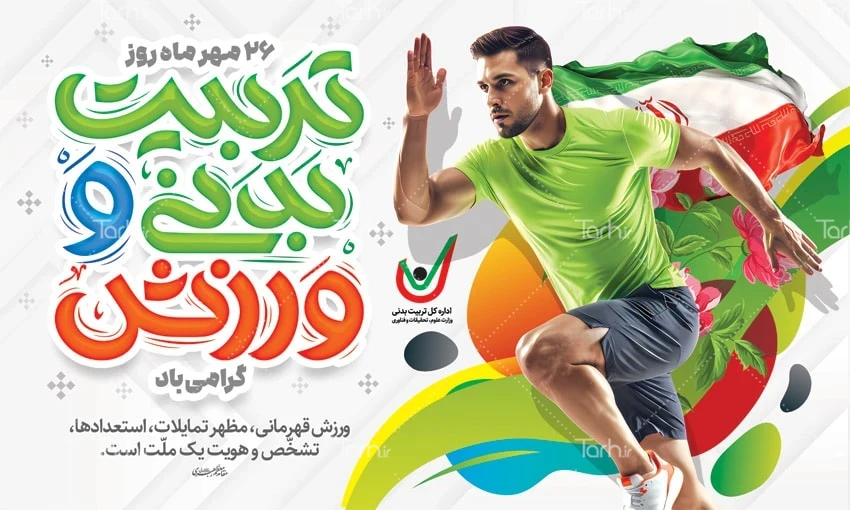 دانلود بنر تبریک روز تربیت بدنی و ورزش با فرمت psd و قابل ویرایش در نرم افزار فتوشاپ به صورت لایه باز توسط تیم طراحان طرح دات آی آر طراحی شده است. در طرح لایه باز روز تربیت بدنی از تصاویر و المان های با کیفیت و متناسب با استاندارد چاپ استفاده گردیده است. طرح بنر روز تربیت بدنی و ورزش شامل تایپوگرافی تربیت بدنی و ورزش، عکس ورزشکار و وکتور پرچم ایران می باشد که المان های استفاده شده در بنر روز تربیت بدنی و ورزش قابلیت ویرایش، جابه جایی و تغییر سایز را دارا بوده و شما می توانید متناسب با سلیقه خودتان طرح روز تربیت بدنی را ویرایش نمایید.