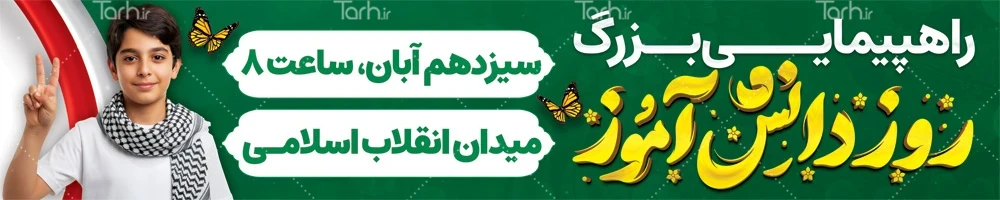 طرح بنر بیلبورد اطلاعیه راهپیمایی 13 آبان با فرمت psd و قابل ویرایش در نرم افزار فتوشاپ به صورت لایه باز توسط تیم طراحان طرح دات آی آر طراحی شده است. در بنر بیلبورد 13 آبان از تصاویر و المان های با کیفیت و متناسب با استاندارد چاپ استفاده گردیده است. بنر اطلاعیه راهپیمایی 13 آبان و روز دانش آموز شامل خوشنویسی روز دانش آموز، عکس دانش آموز پسر، پرچم ایران و متن راهپیمایی بزرگ سیزده آبان می باشد که المان های استفاده شده در طرح بنر اطلاع رسانی راهپیمایی 13 آبان و روز دانش آموز قابلیت ویرایش، جابه جایی و تغییر سایز را دارا بوده و شما می توانید متناسب با سلیقه خودتان بنر لایه باز اطلاعیه راهپیمایی روز دانش آموز و 13 آبان را ویرایش نمایید.