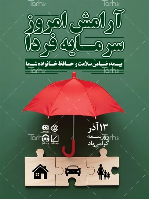 پوستر خام روز بیمه با فرمت psd و قابل ویرایش در نرم افزار فتوشاپ به صورت لایه باز توسط تیم طراحان طرح دات آی آر طراحی شده است. در طرح لایه باز روز بیمه از تصاویر و المان های با کیفیت و متناسب با استاندارد چاپ استفاده گردیده است. طرح بنر روز ملی بیمه شامل متن آرامش امروز سرمایه فردا و تصویر چتر میباشد که المان های استفاده شده در بنر لایه باز روز بیمه قابلیت ویرایش، جابه جایی و تغییر سایز را دارا بوده و شما می توانید متناسب با سلیقه خودتان طرح بنر روز بیمه را ویرایش نمایید.
