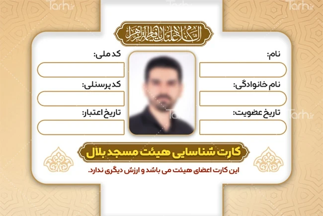 طرح کارت عضویت هیئت با فرمت psd و قابل ویرایش در نرمافزار فتوشاپ بهصورت لایه باز و پشت و رو (دو رو) توسط تیم طراحان طرح دات آی آر طراحی شده است. طرح کارت عضویت هیئت از تصاویر و المانهای باکیفیت و متناسب با استاندارد چاپ استفادهشده، همچنین نکات مهم در طرح کارت مانند رنگبندی، رعایت حاشیه، فاصلهها، فضای کافی برای درج متن، سایز و نوع فونت مناسب طراحی کارت و ... رعایت گردیده است. نمونه کارت عضویت هیئت سینه زنی شامل محل جایگذاری عکس و مشخصات و خوشنویسی السلام علیک یا فاطمه الزهرا میباشد که المانهای استفادهشده در طرح کارت هیئت مسجد قابلیت ویرایش، جابهجایی و تغییر سایز را دارا بوده و شما میتوانید متناسب باسلیقه خودتان کارت شناسایی هیئت را ویرایش نمایید، همچنین با تغییر تصاویر و متنها میتوانید طرح کارت ثبت نام هیئت مذهبی را به طرح کارت کسب و کار مد نظر خود شخصی سازی نمایید.