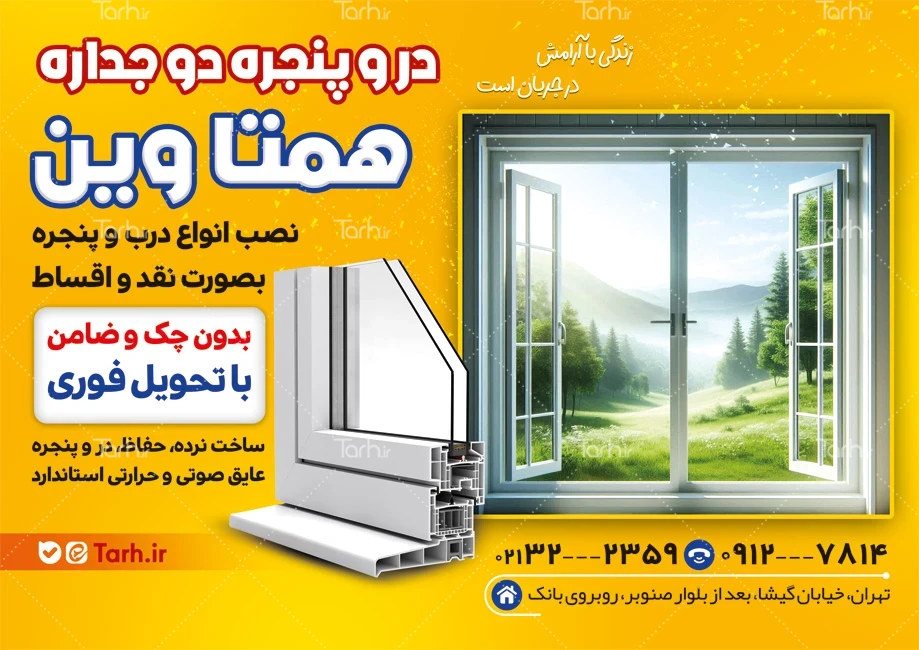 طرح تراکت فروشگاه پنجره دو جداره با فرمت psd و قابل ویرایش در نرمافزار فتوشاپ بهصورت لایه باز توسط تیم طراحان طرح دات آی آر طراحی شده است. در نمونه تراکت فروشگاه در و پنجره upvc از تصاویر و المانهای باکیفیت و متناسب با استاندارد چاپ استفادهشده، همچنین نکات مهم در طرح تراکت درب و پنجره دوجداره مانند رنگبندی، رعایت حاشیه، فاصلهها، فضای کافی برای درج متن، سایز و نوع فونت مناسب طراحی تراکت و ... رعایت گردیده است. طرح لایه باز تراکت درب و پنجره دوجداره شامل عکس پنجره دوجداره و متن تبلیغاتی فروش و نصب درب و پنجره دوجداره میباشد که المانهای استفادهشده در طرح تراکت پنجره دوجداره قابلیت ویرایش، جابهجایی و تغییر سایز را دارا بوده و شما میتوانید متناسب باسلیقه خودتان تراکت لایه باز درب و پنجره دوجداره را ویرایش نمایید، همچنین با تغییر تصاویر و متنها میتوانید طرح تراکت فروشگاه پنجره دوجداره را به طرح تراکت کسب و کار مد نظر خود شخصی سازی نمایید.