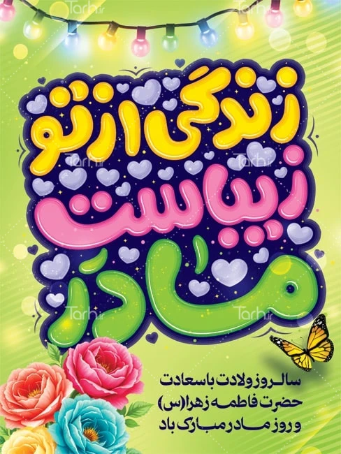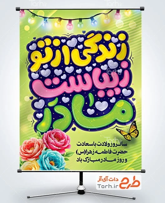 دانلود طرح بنر گرامیداشت روز مادر با فرمت psd و قابل ویرایش در نرم افزار فتوشاپ به صورت لایه باز توسط تیم طراحان طرح دات آی آر طراحی شده است. در طرح لایه باز روز مادر از تصاویر و المان های با کیفیت و متناسب با استاندارد چاپ استفاده گردیده است. بنر لایه باز ولادت حضرت فاطمه و روز زن شامل تایپوگرافی زندگی از تو زیباست مادر و وکتور گل و چراغانی میباشد که المان های استفاده شده در طرح بنر خام روز مادر قابلیت ویرایش، جابه جایی و تغییر سایز را دارا بوده و شما می توانید متناسب با سلیقه خودتان طرح روز مادر را ویرایش نمایید.