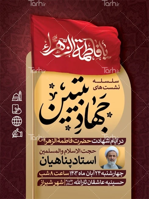 پوستر خام اطلاع رسانی جهاد تبیین با فرمت psd و قابل ویرایش در نرم افزار فتوشاپ به صورت لایه باز توسط تیم طراحان طرح دات آی آر طراحی شده است. در طرح لایه باز اطلاعیه جهاد تبیین از تصاویر و المان های با کیفیت و متناسب با استاندارد چاپ استفاده گردیده است. طرح اطلاعیه خام جهاد تبیین شامل خوشنویسی جهاد تبیین، یا فاطمه الزهرا و دارای زمان و مکان مراسم جهاد تبیین می باشد که المان های استفاده شده در بنر جهاد تبیین قابلیت ویرایش، جابه جایی و تغییر سایز را دارا بوده و شما می توانید متناسب با سلیقه خودتان طرح بنر شهادت حضرت فاطمه را ویرایش نمایید.