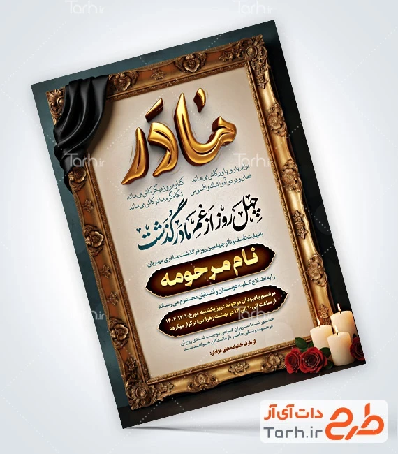 طرح اعلامیه ترحیم چهلمین روز درگذشت مادر با فرمت psd و قابل ویرایش در نرمافزار فتوشاپ بهصورت لایه باز توسط تیم طراحان طرح دات آی آر طراحی شده است. در فایل اعلامیه ترحیم مادر از تصاویر و المانهای باکیفیت و متناسب با استاندارد چاپ استفادهشده، همچنین نکات مهم در طرح آگهی ترحیم چهلم مادر مانند رنگبندی، رعایت حاشیه، فاصلهها، فضای کافی برای درج متن، سایز و نوع فونت مناسب طراحی آگهی ترحیم و ... رعایت گردیده است. طرح لایه باز آگهی فوت مادر شامل خوشنویسی چهل روز از غم مادر گذشت، تایپوگرافی مادر و عکس شمع و گل میباشد که المانهای استفادهشده در آگهی ترحیم لایه باز مادر قابلیت ویرایش، جابهجایی و تغییر سایز را دارا بوده و شما میتوانید متناسب باسلیقه خودتان نمونه اعلامیه ترحیم مادر را ویرایش نمایید.