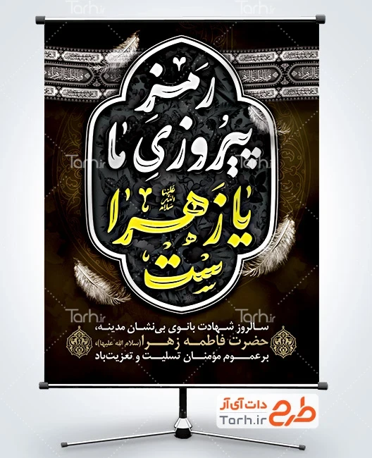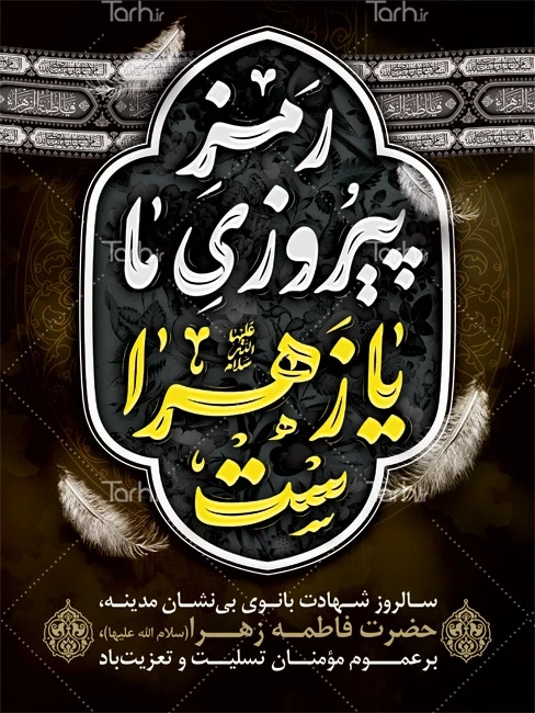 طرح بنر لایه باز شهادت حضرت فاطمه با خوشنویسی شعار رمز پیروزی ما یا زهراست کد فایل 8019735