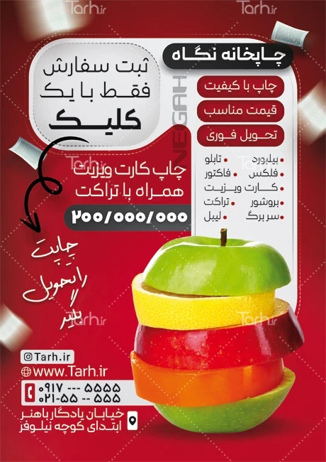 فایل تراکت چاپخانه با فرمت psd و قابل ویرایش در نرمافزار فتوشاپ بهصورت لایه باز توسط تیم طراحان طرح دات آی آر طراحی شده است. در نمونه تراکت چاپ خانه از تصاویر و المانهای باکیفیت و متناسب با استاندارد چاپ استفادهشده، همچنین نکات مهم در طرح تراکت چاپخانه مانند رنگبندی، رعایت حاشیه، فاصلهها، فضای کافی برای درج متن، سایز و نوع فونت مناسب طراحی تراکت و ... رعایت گردیده است. طرح لایه باز تراکت چاپخانه شامل عکس سیب رنگی میباشد که المانهای استفادهشده در طرح تراکت چاپ و تبلیغات قابلیت ویرایش، جابهجایی و تغییر سایز را دارا بوده و شما میتوانید متناسب باسلیقه خودتان تراکت لایه باز چاپخانه را ویرایش نمایید، همچنین با تغییر تصاویر و متنها میتوانید طرح تراکت چاپ دیجیتال را به طرح تراکت کسب و کار مد نظر خود شخصی سازی نمایید.