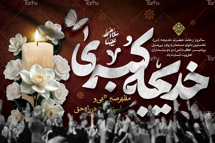 دانلود بنر پشت سن وفات حضرت خدیجه با فرمت psd و قابل ویرایش در نرم افزار فتوشاپ به صورت لایه باز توسط تیم طراحان طرح دات آی آر طراحی شده است. در بنر لایه باز رحلت حضرت خدیجه کبری از تصاویر و المان های با کیفیت و متناسب با استاندارد چاپ استفاده گردیده است. بنر پشت منبری وفات حضرت خدیجه شامل تایپوگرافی خدیجه کبری و عکس گل و شمع می باشد که المان های استفاده شده در بنر لایه باز وفات حضرت خدیجه کبری قابلیت ویرایش، جابه جایی و تغییر سایز را دارا بوده و شما می توانید متناسب با سلیقه خودتان طرح دکور کتیبه رحلت حضرت خدیجه کبری را ویرایش نمایید.