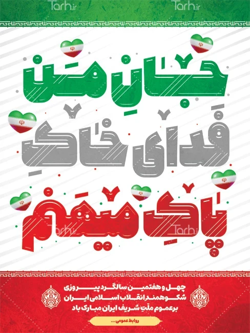 دانلود پوستر دهه فجر با فرمت psd و قابل ویرایش در نرم افزار فتوشاپ به صورت لایه باز توسط تیم طراحان طرح دات آی آر طراحی شده است. در طرح لایه باز دهه فجر از تصاویر و المان های با کیفیت و متناسب با استاندارد چاپ استفاده گردیده است. طرح پوستر آماده دهه فجر شامل تایپوگرافی جان من فدای خاک پاک میهنم، عکس پرچم ایران میباشد که المان های استفاده شده در طرح بنر جشن انقلاب قابلیت ویرایش، جابه جایی و تغییر سایز را دارا بوده و شما می توانید متناسب با سلیقه خودتان طرح دهه فجر را ویرایش نمایید.