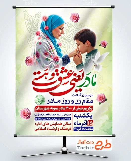 طرح پوستر اطلاع رسانی همایش تکریم روز مادر دارای خوشنویسی مادر یعنی عشق و هستی کد فایل 8236497