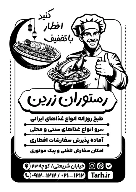 نمونه تراکت سیاه سفید رستوران تخفیف ویژه ماه رمضان کد فایل 8240759